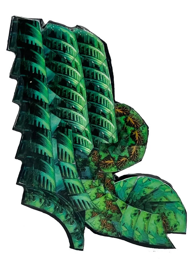 Acryllic Paint, MDF, Nails, Wood Glue, Modge Podge, Cardstock(Magic Cards), Metal Hanger, Resin, Polishing Compound, Carnauna Wax